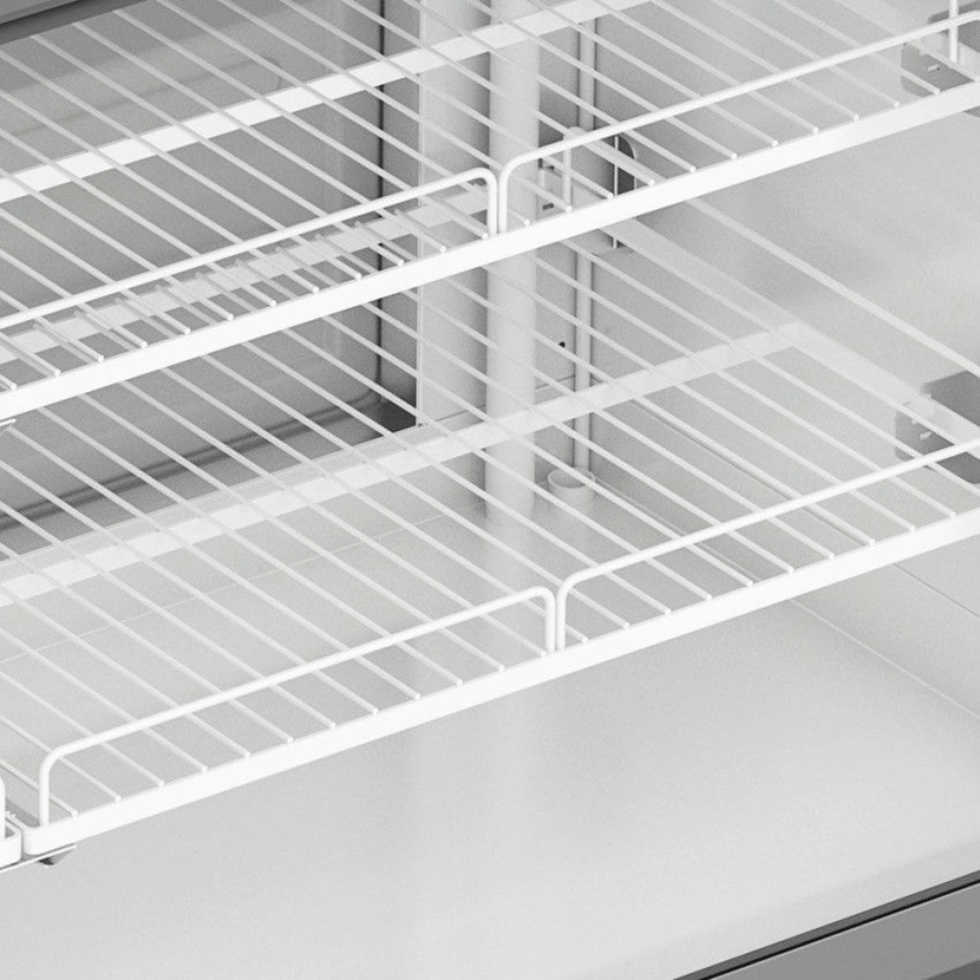 Cuenta con 2 niveles con parrillas de alambre, ofreciendo mayor capacidad de exhibición en comparación con vitrinas compactas.