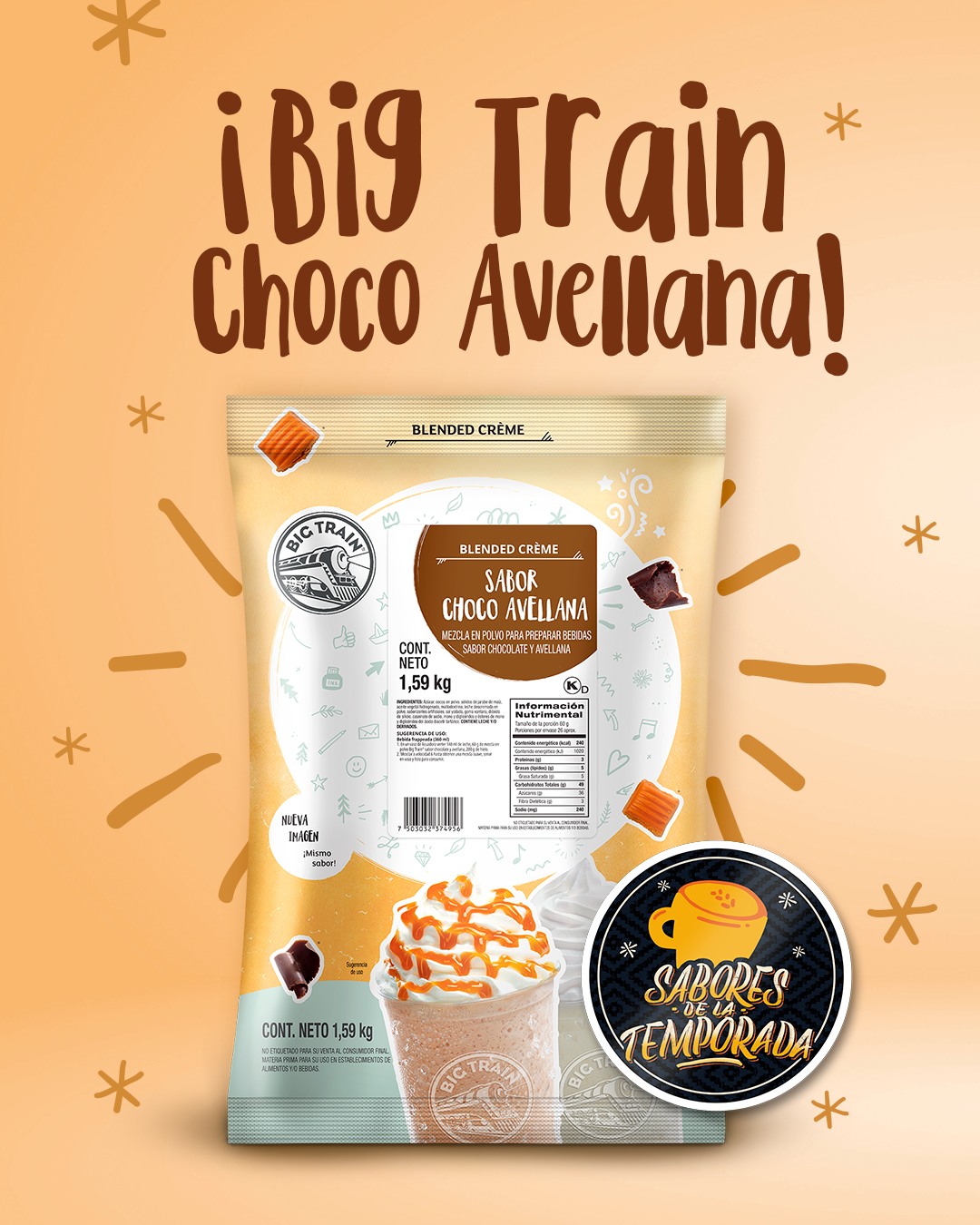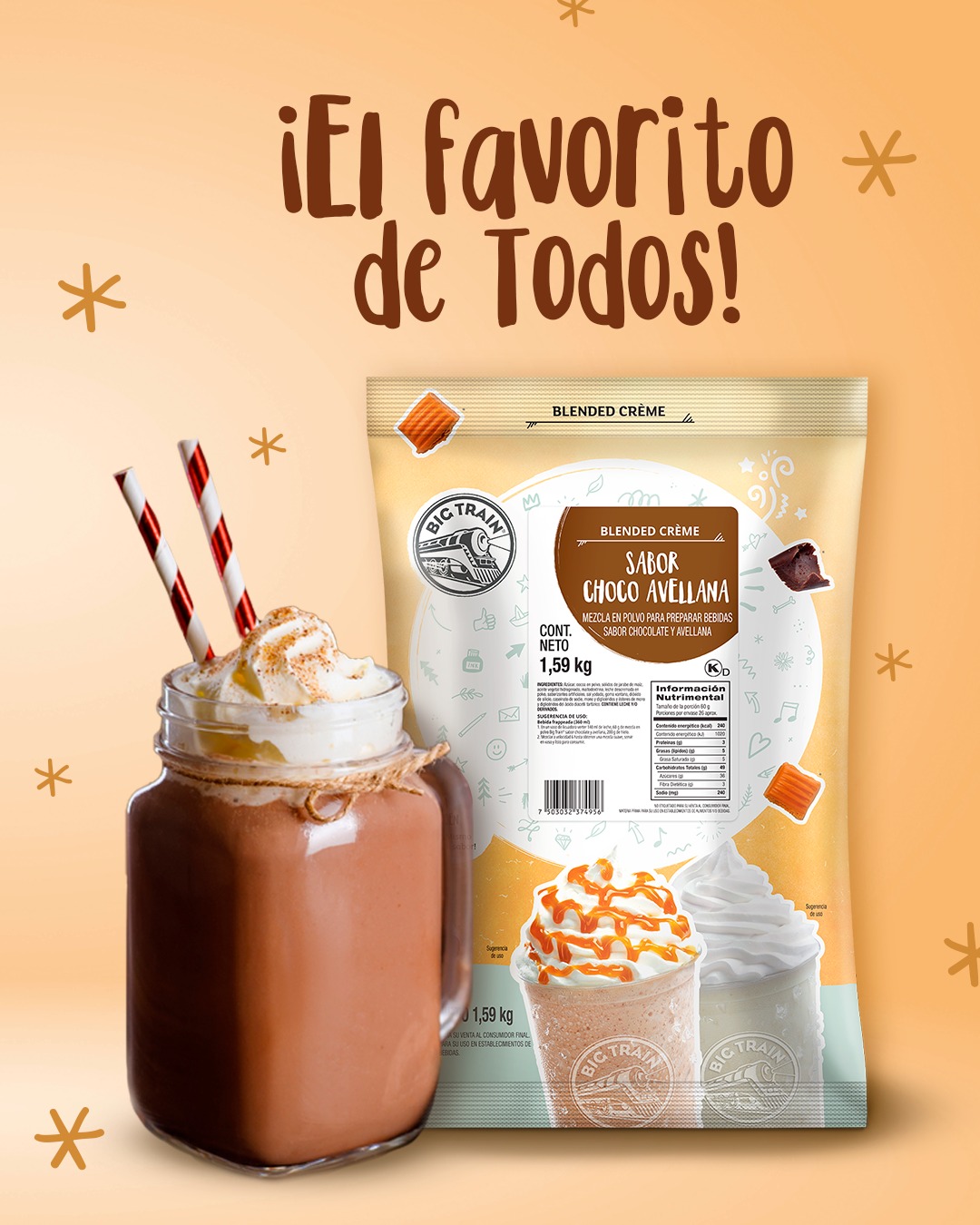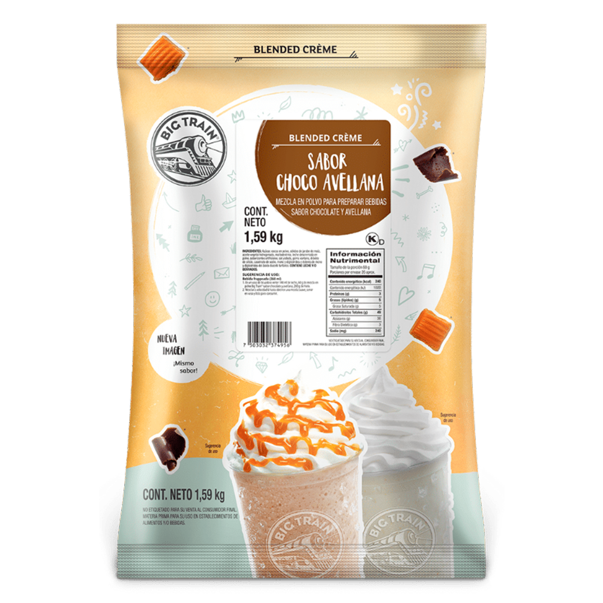 - Contenido: Mezcla en polvo para frappés y bebidas sabor choco avellana.